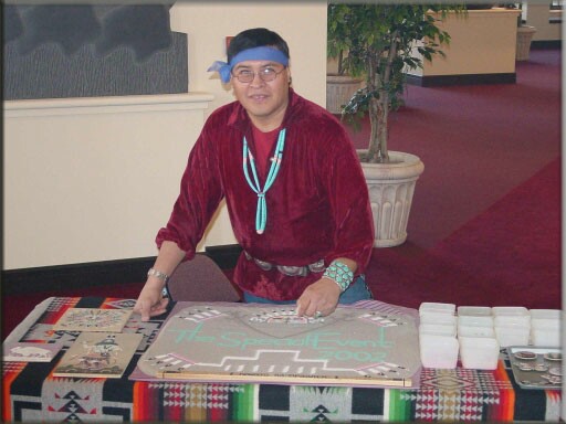 Sandpainting is an ancient Navajo healing art. Our authentic Sandpainter displays amazing artistry and dexterity while creating “paintings” that portray deities and symbols that are sacred to the Navajo people.